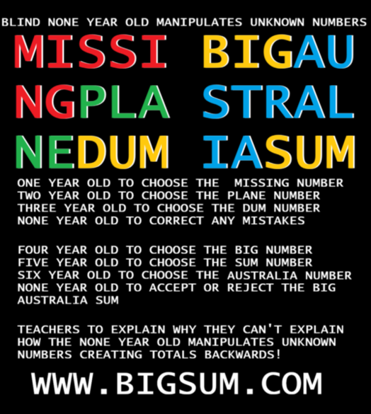 Impossible but true!....Nought year old babies from Nought School to demonstrate creating the 21 digit Dum Dum for the 30 digit Dum Sums, in the infinite  Big Sums, that teachers can't understand or create                                  coming soon